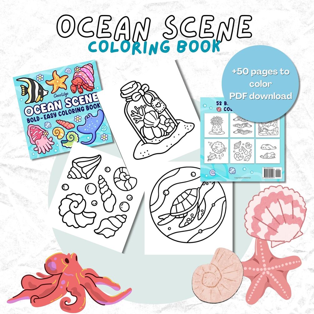 This "Ocean Scene Coloring Book" includes: 52 hand-drawn pages ready for coloring Big, bold, and easy-to-color designs for a delightful coloring experience